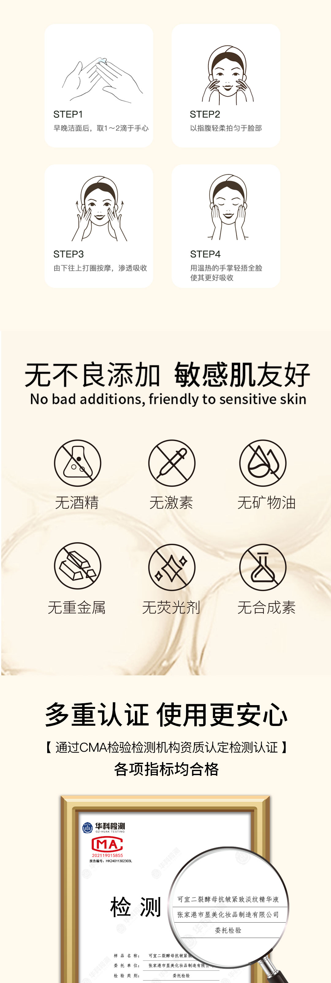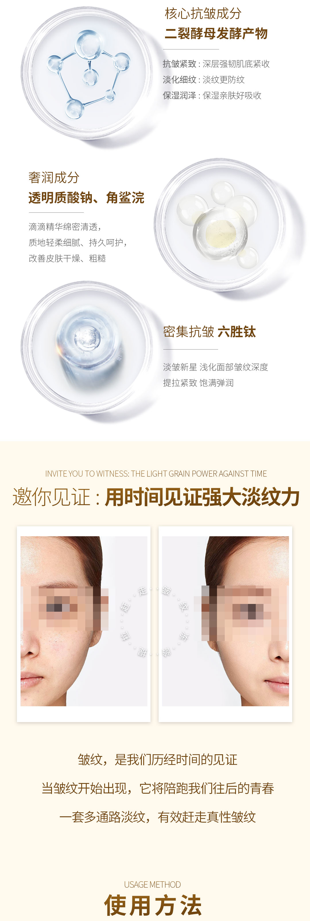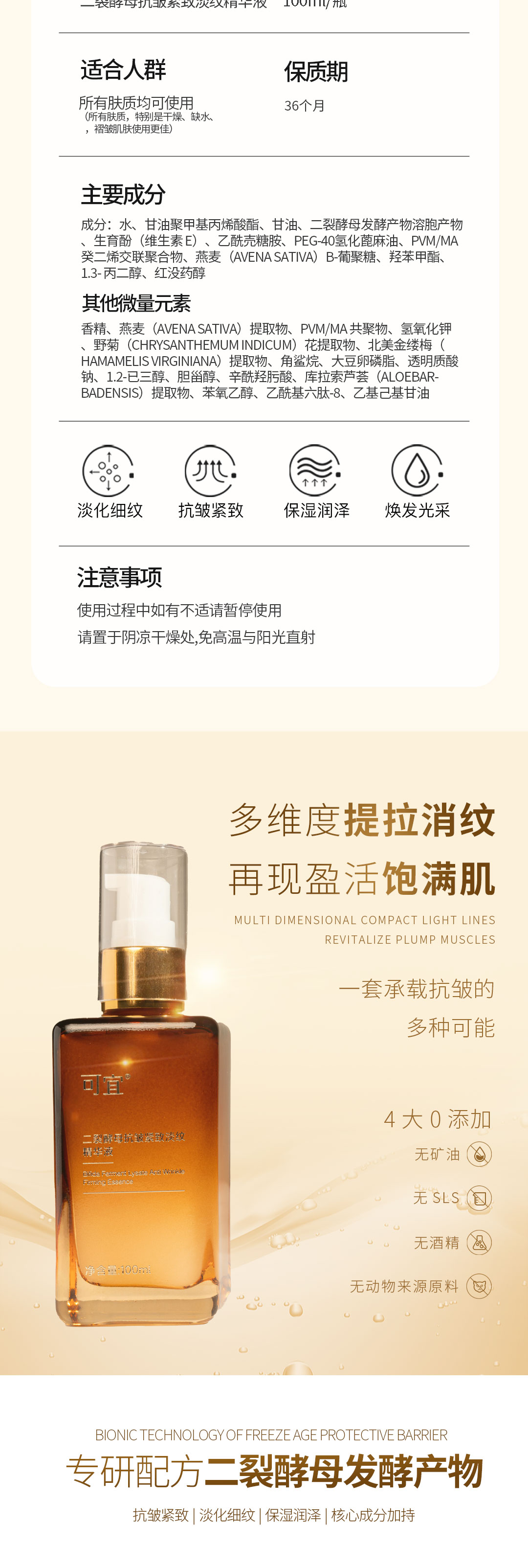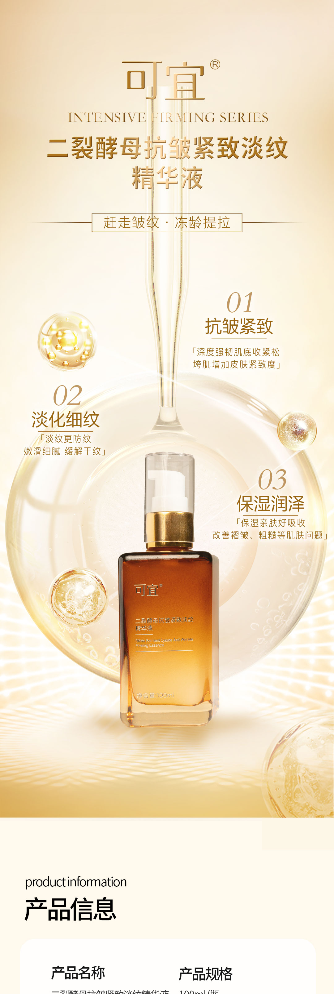本品含有二裂酵母發(fā)酵產(chǎn)物、紅沒藥醇、角鯊?fù)?、六勝肽等奢潤成分,滴滴精華綿密清透,質(zhì)地輕柔細(xì)膩,能滋潤呵護肌膚,淡化細(xì)紋,使皮膚緊致嫩滑,改善皮膚干燥、粗糙。令皮膚飽滿彈潤水嫩,煥發(fā)自信光彩。